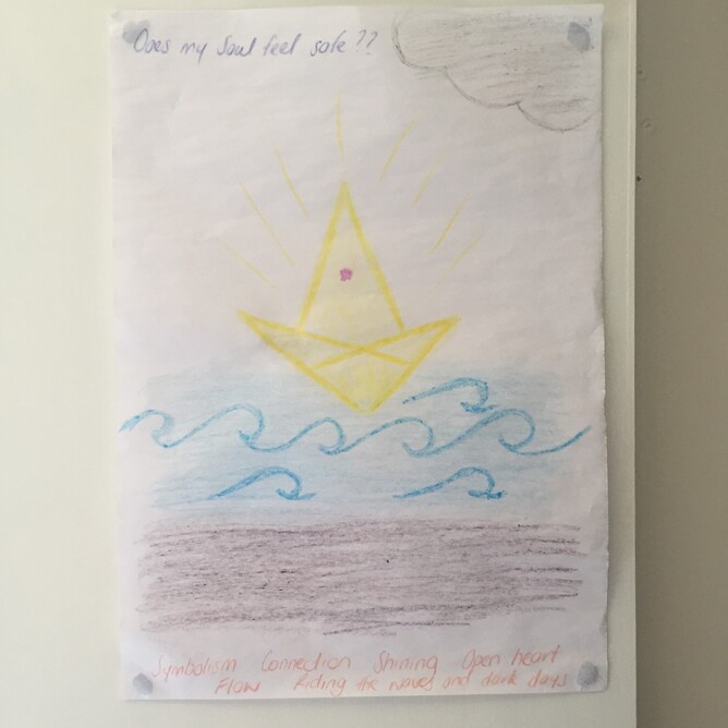 To give you the gist of it - I am the star in the middle sitting in yoga position riding the waves of life. I am a star because I strive to be a bright light and safe place for people, my heart is drawn because living through my heart is so important to me and something I am continuously working on.